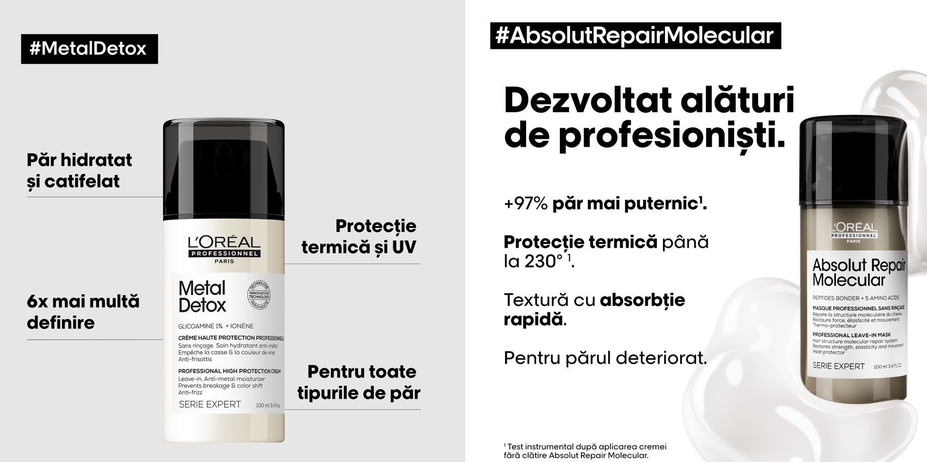 Pasul 4: Inainte de coafat, aplicati un produs de coafat ( leave-in ) fara clatire cu protectie termica L’Oreal Professionnel, pe parul umed pentru protectia termica si rezultate de lunga durata.