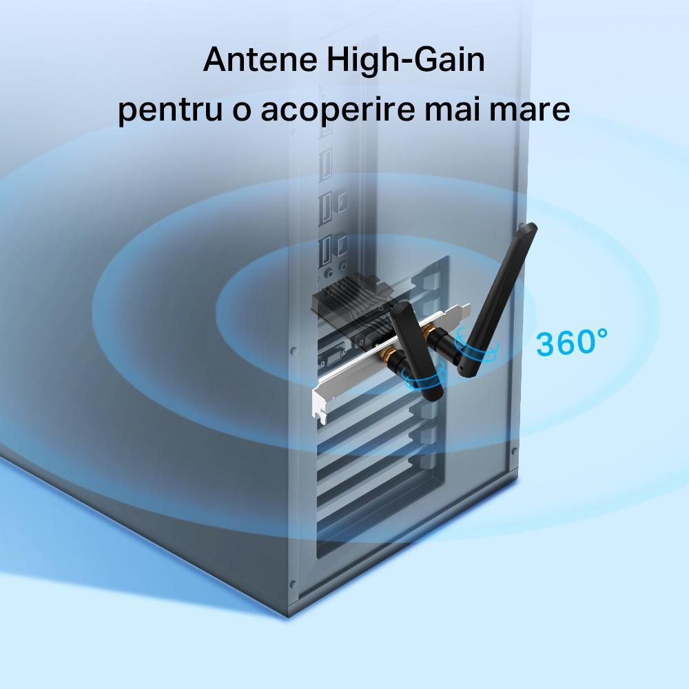 TP-Link Adaptor PCle Wi-Fi 6 AX3000 WI-FI 6 cu Bluetooth 5.2 ARCHER TX55E, 2× Antene Dual-Band High-Gain, Standarde wireless: IEEE 802.11ax/ac/n/a 5 GHz IEEE 802.11ax/n/g/b 2.4 GHz, Bluetooth 5.2/5.0/4.2/4.0, Viteza wireless: 5 GHz-Up to 2402 Mbps, 2.4Ghz-Up to 574 Mbps,